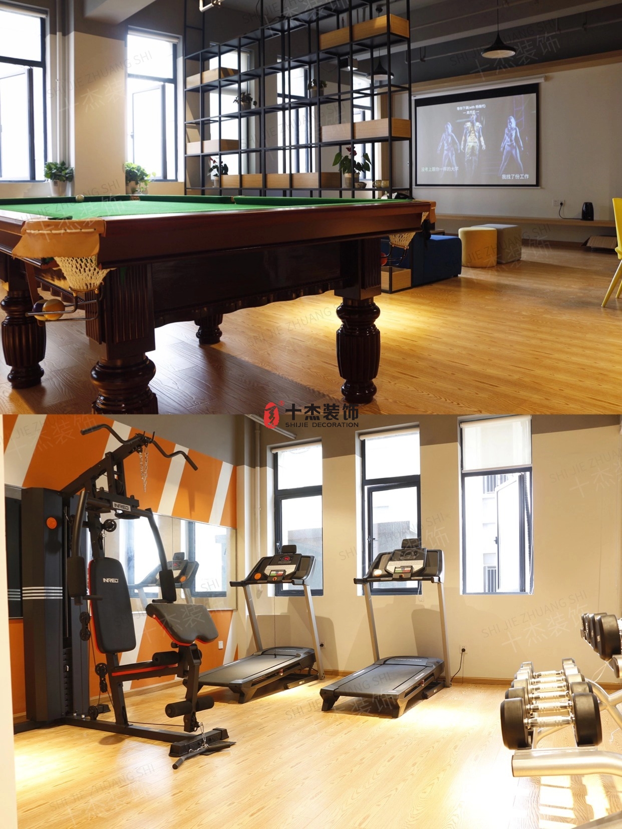 实木台球桌质感拉满,跑步机+哑铃区随时开练