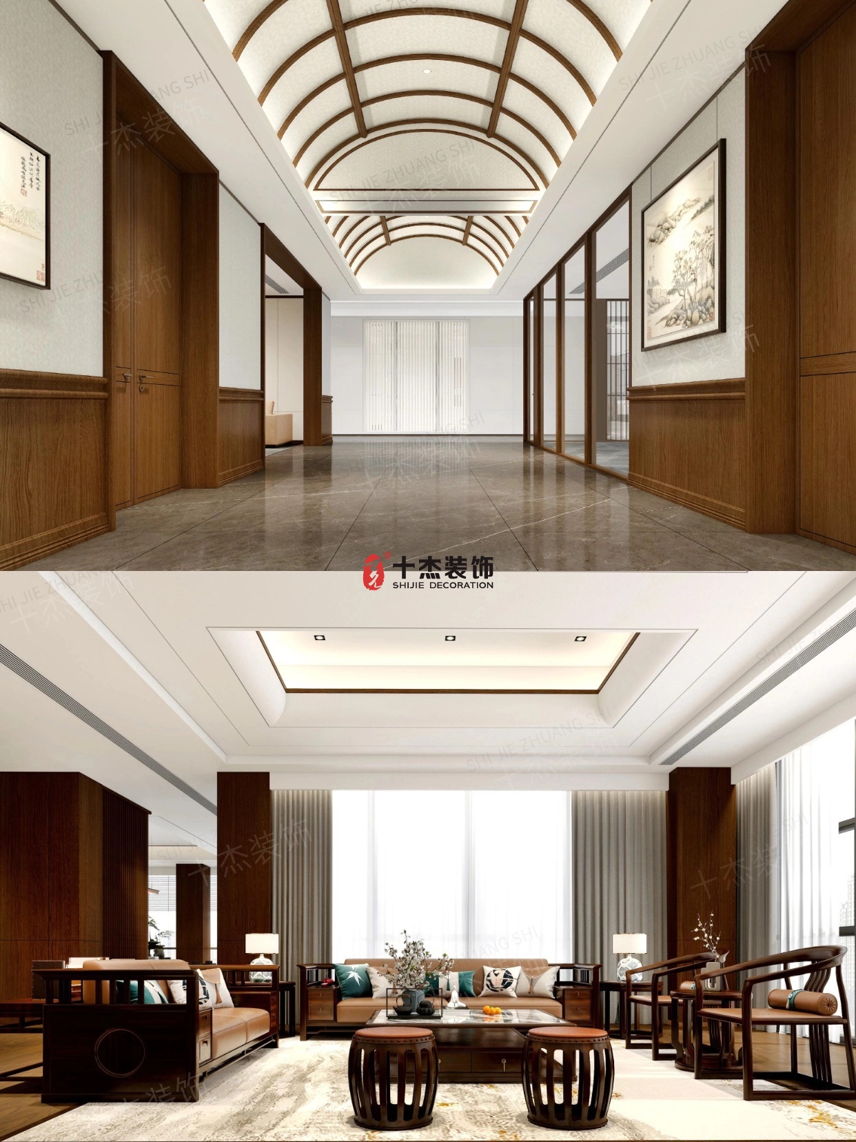 拱形木质吊顶+新中式家具