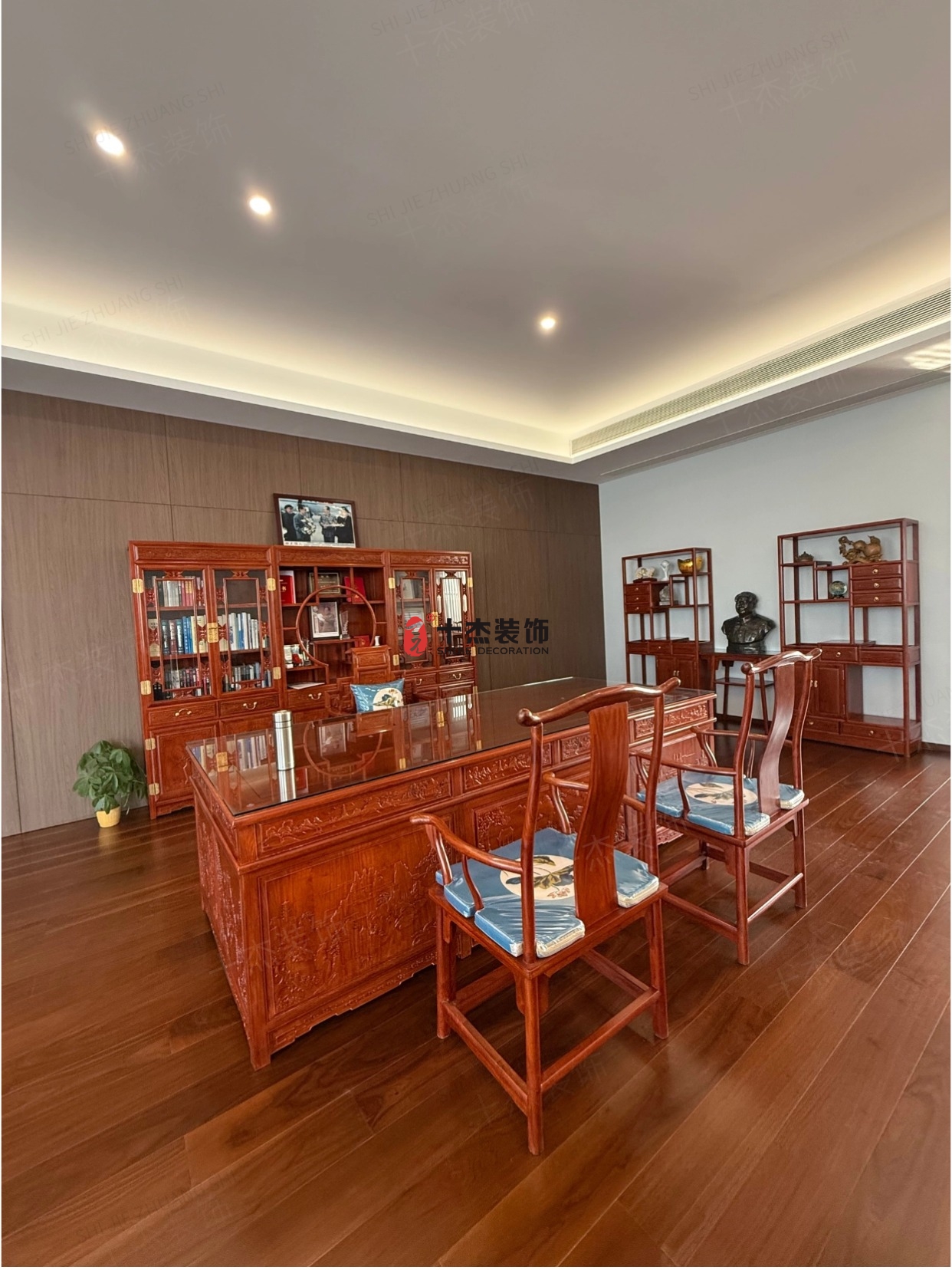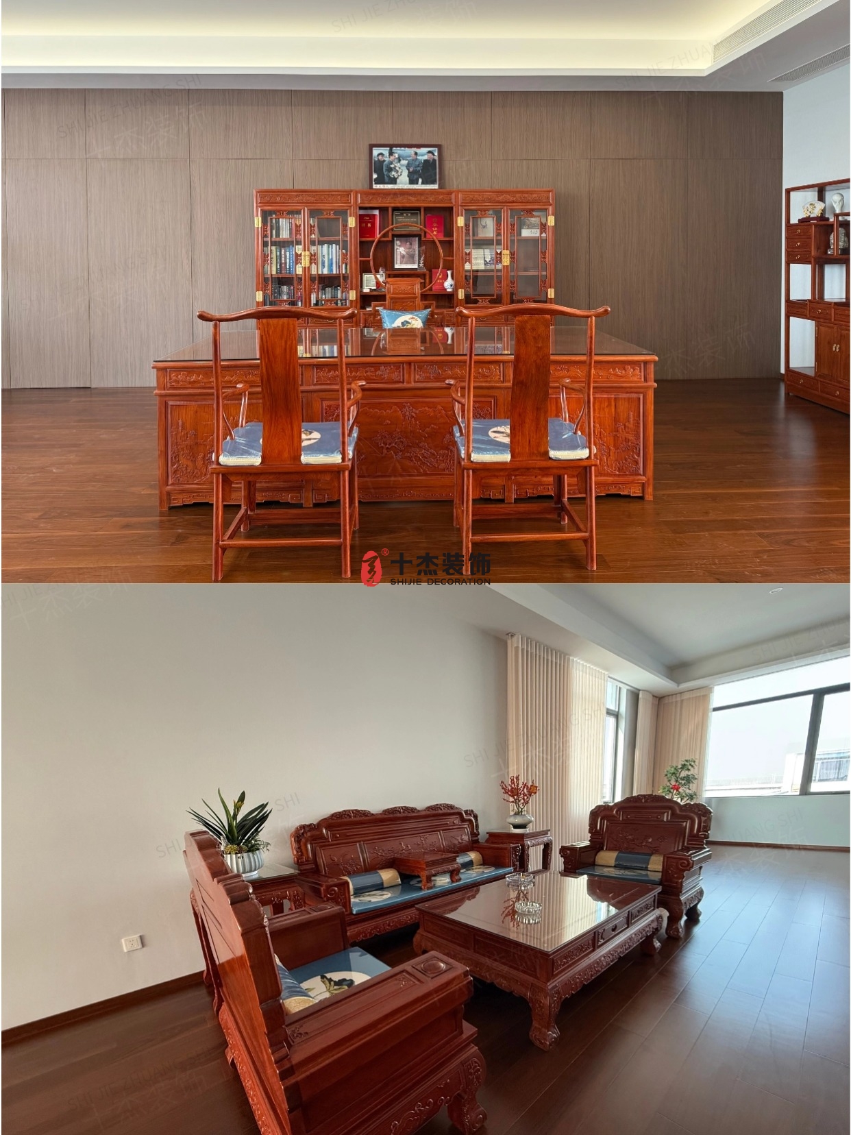 桌、整面书柜、会客沙发全是同系列实木雕花