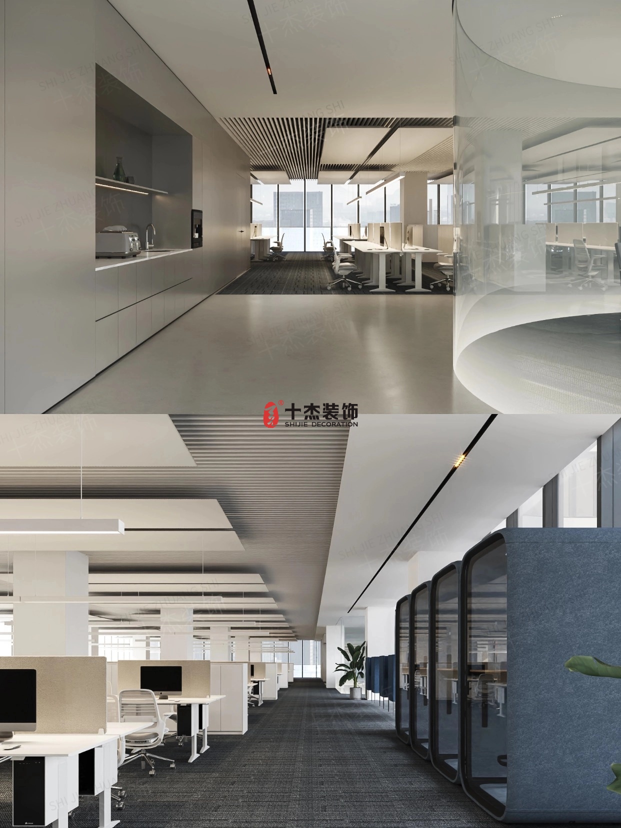 办公区:开放工位+独立玻璃间自由切换,协作与隐私兼顾