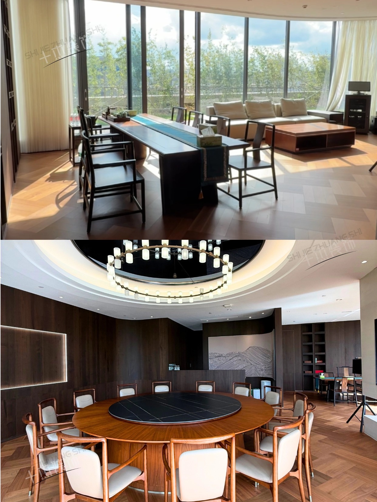 圆形吊顶吊灯+人字拼木地板+大窗采光