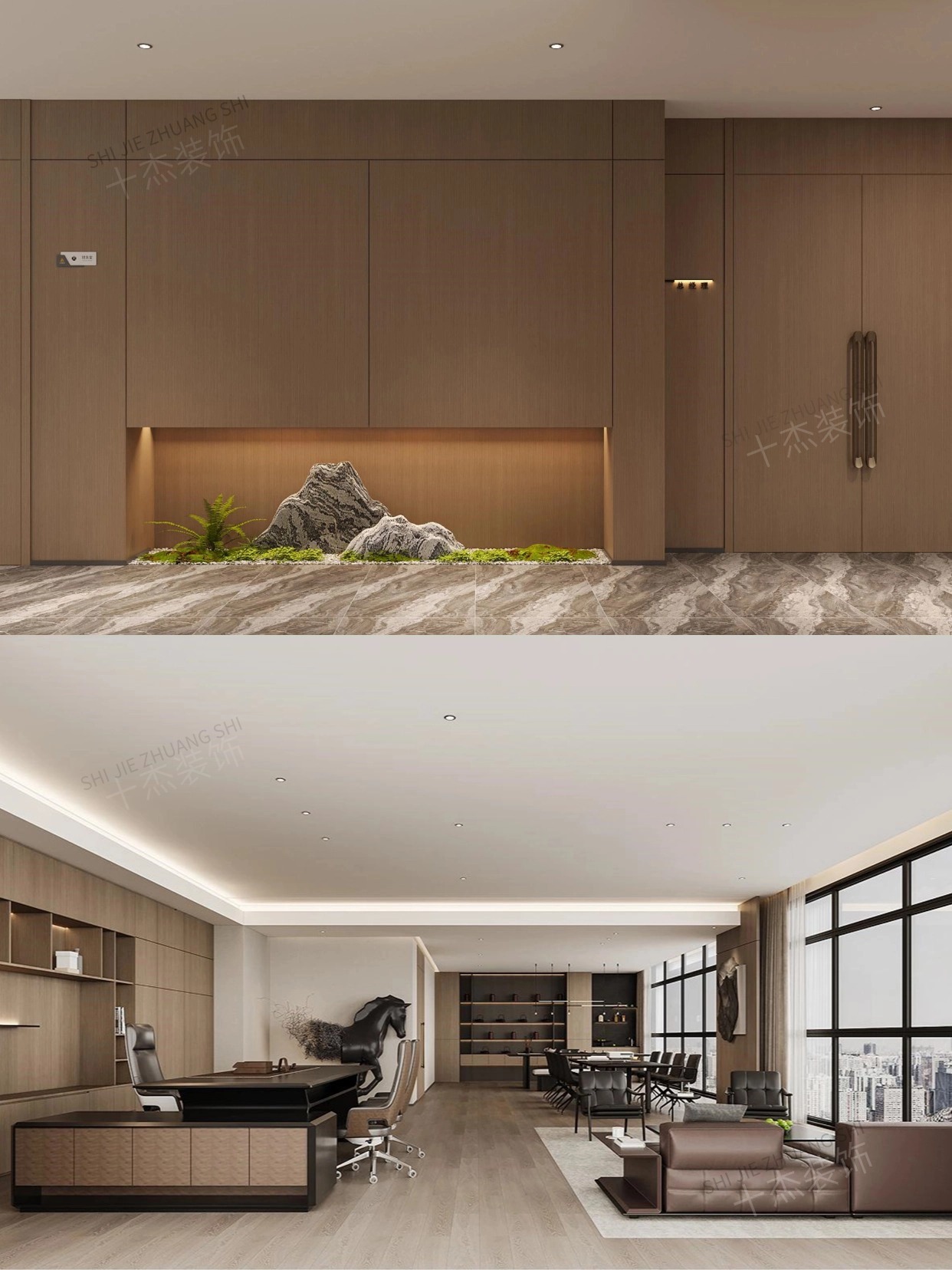 木饰面+艺术造景,总裁室的山水小景搭配全景落地窗